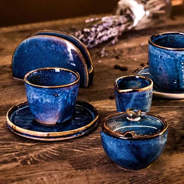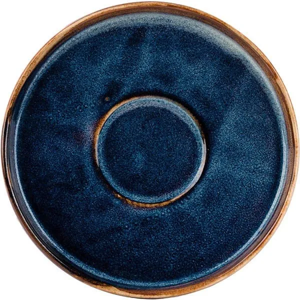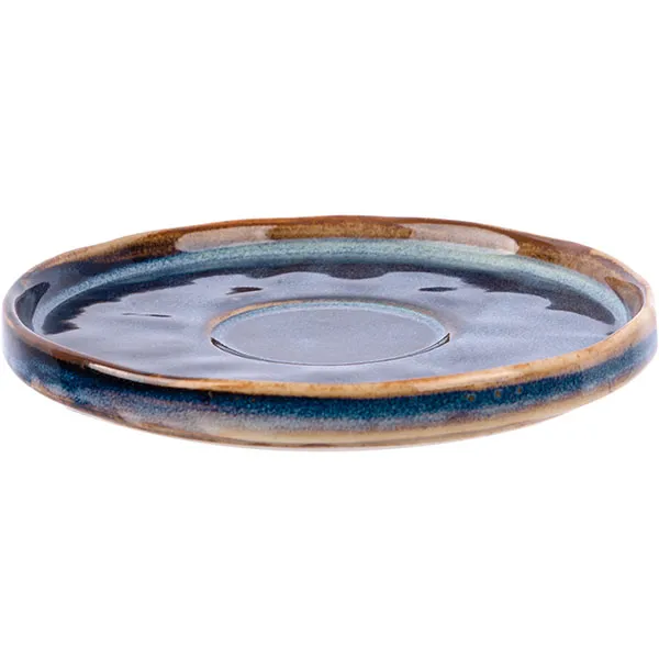 Блюдце «Ирис» от бренда Kunstwerk выполнено из прочного глазурованного фарфора. Его внешний диаметр составляет 135 мм, с углублением диаметром 50 мм для устойчивого размещения чашки, высота – 20 мм. Основной цвет – глубокий сине-голубой с мраморной текстурой разводов, края украшены коричневой окантовкой цвета эспрессо. Фарфор обладает высокой термостойкостью, эффективно защищая поверхность стола от горячей посуды и сохраняя тепло. Покрытие из гладкой глянцевой глазури легко моется. Изделие адаптировано для активного использования и ухода в сфере HoReCa и дома: допускает мойку в посудомоечной машине и нагрев в СВЧ-печи.