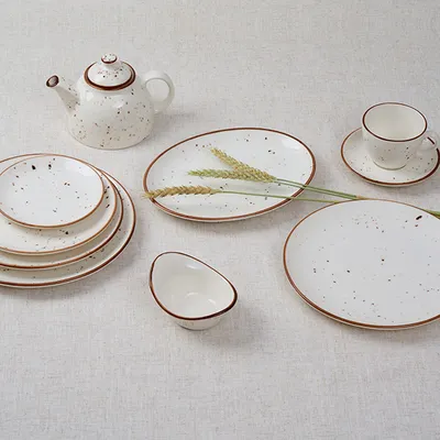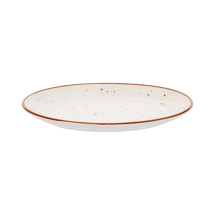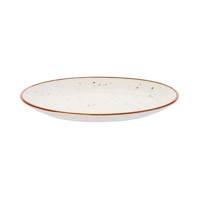 Блюдо «Париж» бренда Kunstwerk – это синтез изысканного дизайна и профессиональной выносливости. Модель изготовлена из высокоплотного фарфора с мягким белым фоном, украшенным хаотичными коричневыми крапинками и контурным кантом.