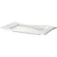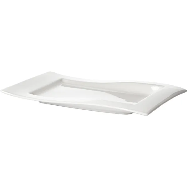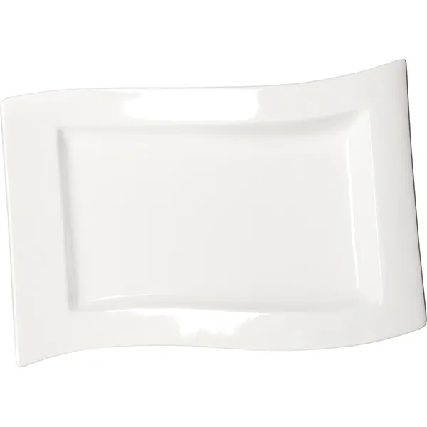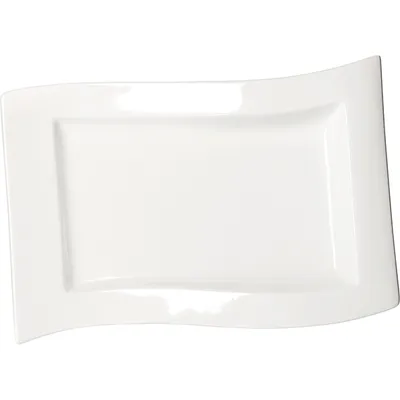 Блюдо бренда «Кунстверк» – это прямоугольное изделие из фарфора с уникальной формой. Силуэт сочетает прямые линии и изогнутые края, создавая эффект волны. Такой дизайн позволяет сделать акцент на стильность при сервировке стола. Белый цвет нейтрален, акцентирует внимание на подаваемом угощении и позволяет использовать посуду в любом стиле оформления.