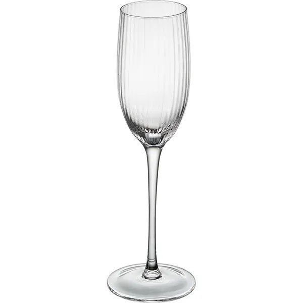 Фужер имеет стильный дизайн – высокая ножка и ребристые края чаши. При соприкосновении двух бокалов слышен чистый хрустальный звон. Стенки не тускнеют со временем и не искажают цвет напитка. Посуду можно мыть в посудомоечной машине. Объем – 220 мл, высота – 240 мм.