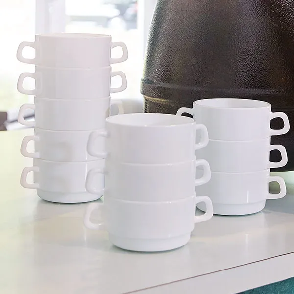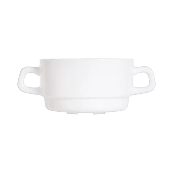 Чашка выполнена из белого матового стекла. По бокам есть две аккуратные небольшие ручки. За счет компактного размера и вместительности это отличный вариант для подачи порционных блюд.