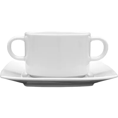 Чашка бульонная «Виктория-отель» бренда Lubiana из фарфора предназначена для сервировки супа в заведениях HoReCa. Ее объем – 320 мл, идеален для порции горячего. Чисто белый подчеркивает элегантность, сочетается со столовой посудой других цветов. Ручки слегка изогнуты, что способствует комфортному удерживанию горячих блюд. В комплекте идет квадратное блюдце со слегка закругленными углами, которое добавляет оригинальности дизайну, делает подачу аккуратной и эффектной.