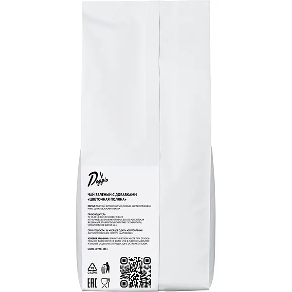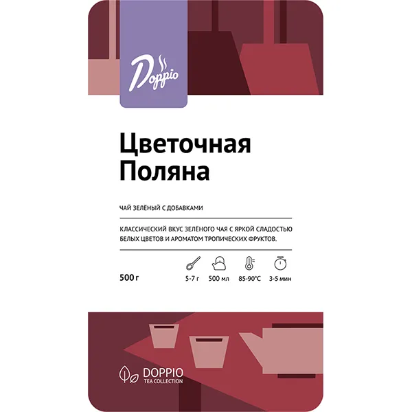Производитель в своей чайной коллекции Doppio tea предлагает зеленый чай с оригинальным вкусом. «Цветочная поляна» содержит китайский листовой чай, цветы мальвы и незабудки, цветочную гамму в этом составе дополняет микс цукатов. Такое сочетание дарит напитку насыщенный аромат свежих цветов и цитрусов, и яркий необычный вкус.