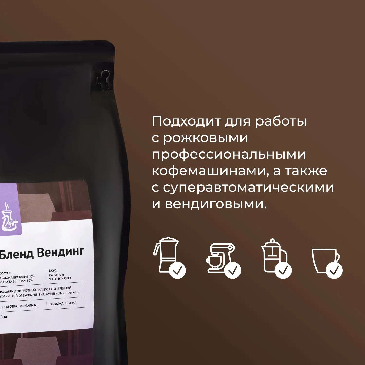 «Бленд Вендинг» разработан для использования в вендинговых автоматах, кофемашинах, может использоваться в домашних аппаратах. С этими зернами готовят эспрессо и напитки на его основе: капучино, латте. Продукт подходит для кофеен, ресторанов, домашнего использования. Также в пользу него стоит сделать выбор владельцам вендинговых автоматов.