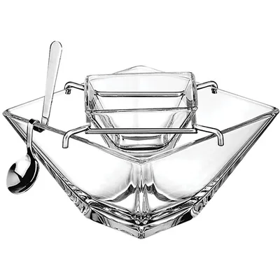 Выполнен из стекла. Состоит из трех предметов, каждый из которых создан с учетом удобства и эстетики. Верхняя чаша предназначена для размещений икры. Подставка под ней удерживает чашу и вмещает лед для охлаждения поданного деликатеса. Третий предмет – ложка со специфической формой. Создана из нейтрального материала, который помогает избежать искажения вкуса даже премиальных сортов.