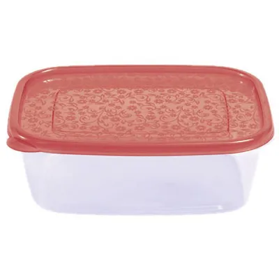 Крышка бордового цвета с мелким узором смотрится ярко. Контейнер имеет большой объем – 1,25 л. Он стандартной прямоугольной формы с высотой 75 мм, шириной 160 мм и длиной 210 мм. Через прозрачные стенки хорошо видно содержимое.