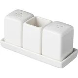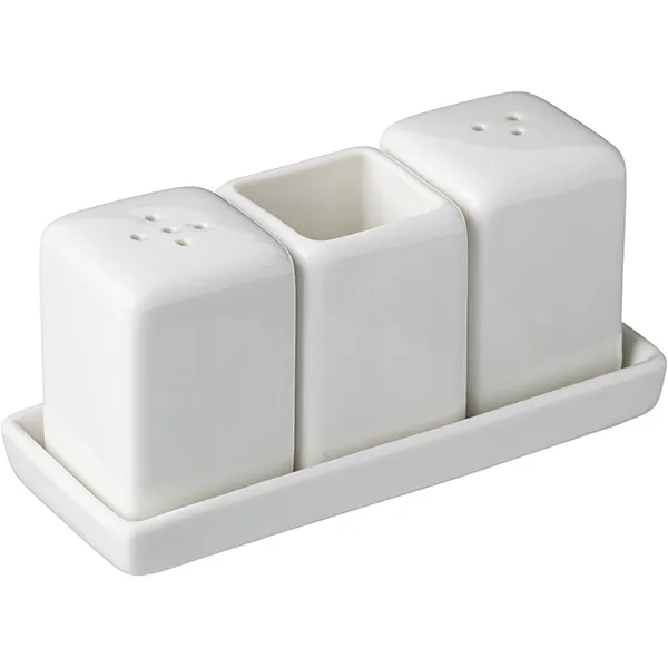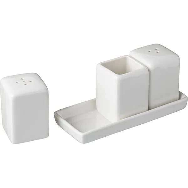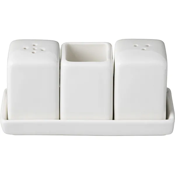 Форма изделия прямая, есть удобная прямоугольная подставка, на которой размещаются прямоугольные коробочки предметов для специй. Материал фарфор. Цвет товара белый. Емкости имеют высоту 60 мм, ширину 55 мм, а длина подставки равна 13 см.