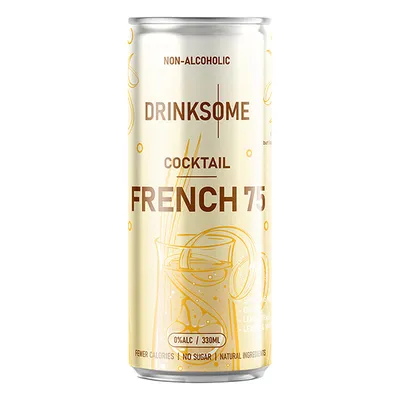 Напиток «Френч 75» бренда Drinksome – стильное решение для тех, кто ценит вкус и изысканность классических коктейлей, но предпочитает безалкогольные варианты. Бутылка из белой жести сохраняет свежесть продукта. Минималистичный, но выразительный дизайн упаковки подчеркивает современный стиль подачи.
