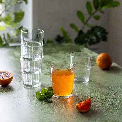 Такой стакан будет стильно смотреться на фоне любой посуды, стеклянной и фарфоровой. Он легко впишется даже в сервировку с яркими акцентами (розовыми, синими), добавляя изысканности вашему столу.