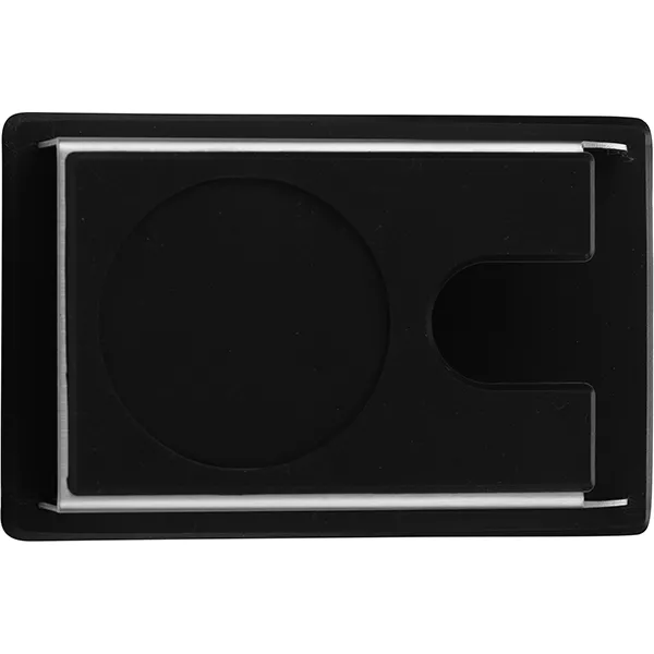 Небольшая стойка выполнена из нержавеющей стали, что обеспечивает легкий уход и позволяет говорить о длительной эксплуатации. Товар представляет собой компактную подставку с силиконовой нескользящей поверхностью для удобства использования. Есть специальная выемка, куда компактно становится темпер, а также проем для подвешивания инструмента.