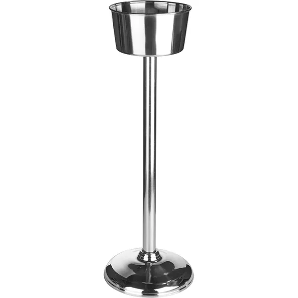 Стильная подставка создана для применения в ресторанном и гостиничном бизнесе. Подставка для ведра «Проотель» изготовлена из прочного материала – нержавеющей стали. Это прочное и долговечное изделие с блестящей поверхностью серебряного цвета. Сочетается с любым декором. Размеры – диаметр 18 см, высота 66 см, ширина круглого основания 22 см – позволяют компактно разместить подставку на полу в любых условиях. Используется с металлическими ведрами под шампанское диаметром 18 см. А также для хранения льда. Ее конструкция обеспечивает устойчивость и безопасность (даже при отсутствии прорезиненных ножек), предотвращая случайное опрокидывание. Это особенно важно в местах с повышенной проходимостью, таких как рестораны, бары или кафе.