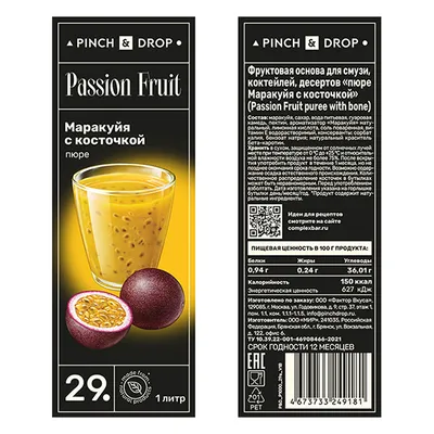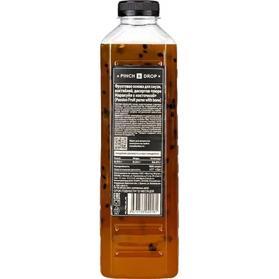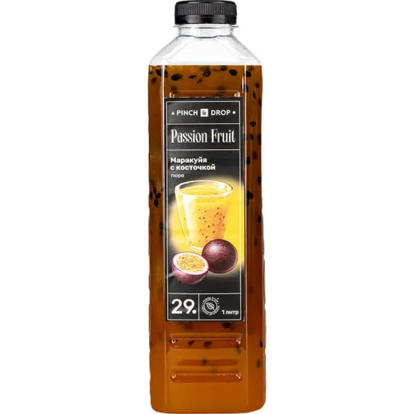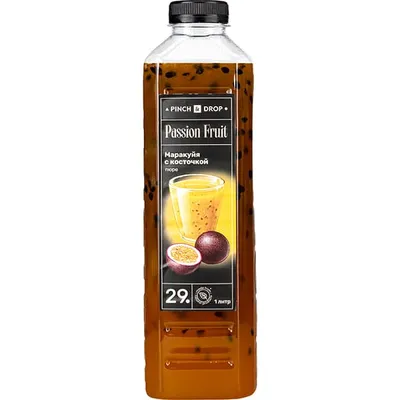 В линейке бренда Pinch&Drop из России большой выбор фруктовых пюре на натуральной основе. «Маракуйя с косточкой» – одна из популярных разновидностей, поскольку у продукта интересная текстура. Во фруктовой массе попадаются небольшие черные косточки, которые делают ее более интересной, подчеркивают натуральность. В составе – натуральная основа из плодов.