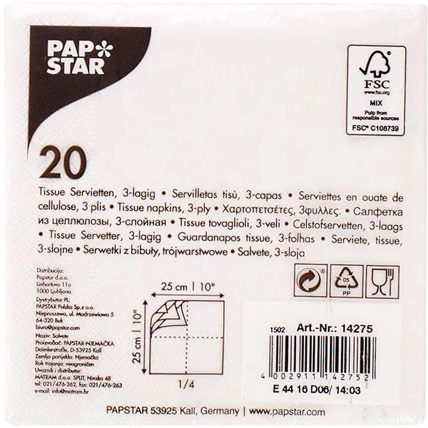 Салфетки бумажные трехслойные 25*25см[20шт] бум. салфет. ,H=2,L=13,B=13см белый
