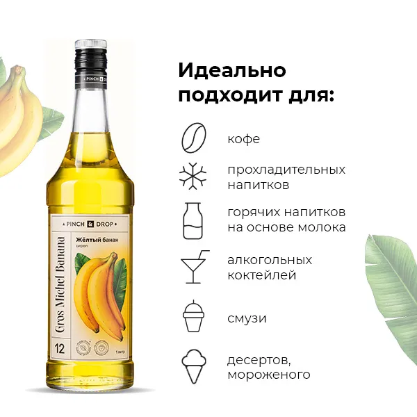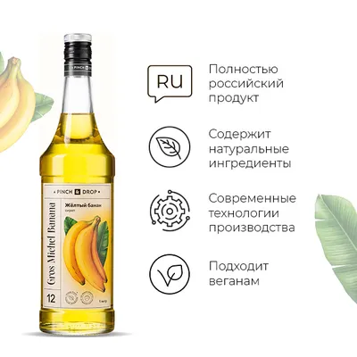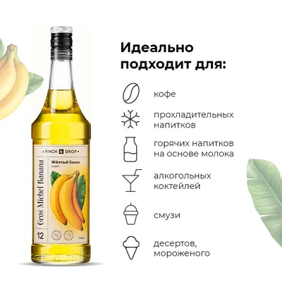 Сироп с банановым вкусом становится фаворитом среди фруктовых добавок. Это сочный букет спелых экзотических фруктов. Он идеально гармонирует с легкими алкогольными коктейлями, у которых основной базой являются фрукты.