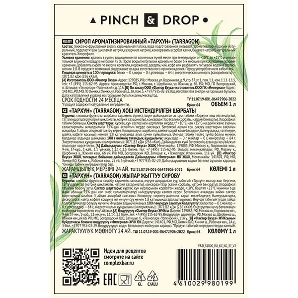 Сироп «Тархун» одновременно сочетает сладкие и горькие ноты. Отчетливо ощущается травяная свежесть, которая добавляет букету шарма. Вкус освежает, насыщает энергией и раскрывается легкими пряными нотками, которые оставляют приятное послевкусие.
