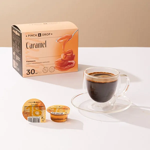 Сироп «Карамель» со вкусом любимой сладости впечатляет мягким и приятным сладким вкусом с оттенками ириса и сгущенного молока. Послевкусие не менее приятное — оно тягучее и выраженное, оставляет на губах мягкий след карамельной неги и вызывает исключительно приятные эмоции.