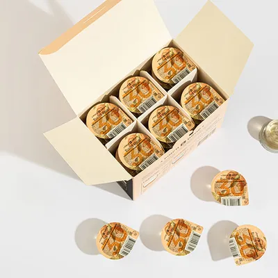 Товар в картонных упаковках в размере 30 штук. Объем каждого пакета 15 мл — удобная дозировка для порционной подачи сиропа в барах или кофейнях.