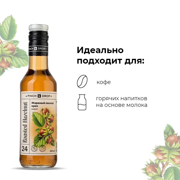 Сироп «Жареный лесной орех» привлекает ценителей сладких ореховых вкусов, которые подчеркивают блюда пряными нотками.