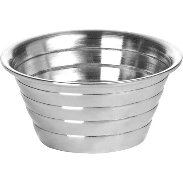 Соусник из металла имеет небольшой размер. Он выполнен из нержавеющей стали, поэтому отличается простотой в уходе и долговечностью. Товар имеет форму расширенной кверху пиалы, на стенках есть мелкие полоски, которые добавляют изделию оригинальность.