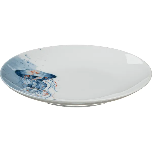 Тарелка Медуза – оригинальное изделие Добрушского фарфорового завода из коллекции «Универсал». Очаровывает уникальностью декора: изящным изображением медузы, которая словно плывет в морской глубине. Рисунок в нежных сине-голубых тонах с легкими оранжевыми акцентами выполнен на белой поверхности тарелки. Создает ощущение воздушности и невесомости, превращая обычную посуду в предмет искусства.