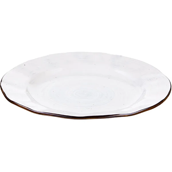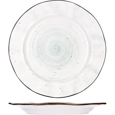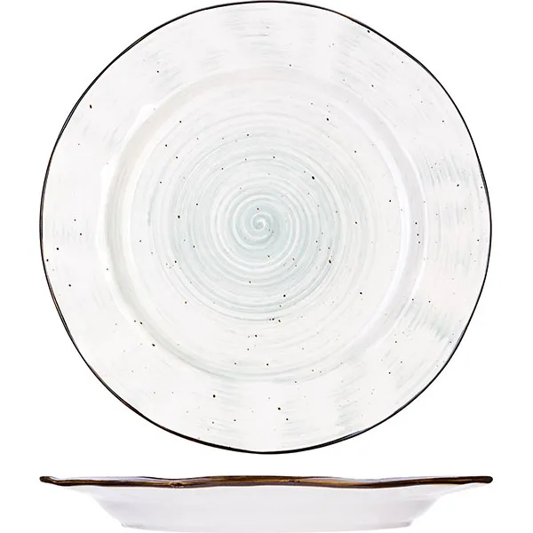 Тарелка выполнена в интересном дизайне – зеленые вкрапления и контрастная окантовка, изогнутый узкий бортик. Посуду можно мыть в посудомоечной машине, использовать в микроволновой печи. Диаметр – 270 см.