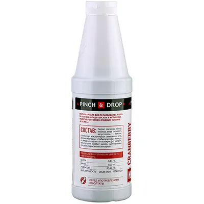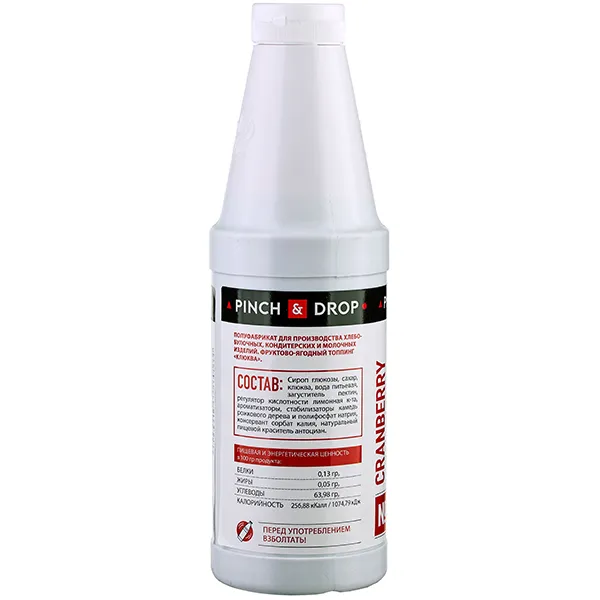 Сироп глюкозы, сахар, клюква, вода питьевая, загуститель пектин, регулятор кислотности лимонная к-та, ароматизаторы, стабилизаторы - камедь рожкового дерева и полифосфат натрия, консервант сорбат калия, натуральный пищевой краситель антоциан.